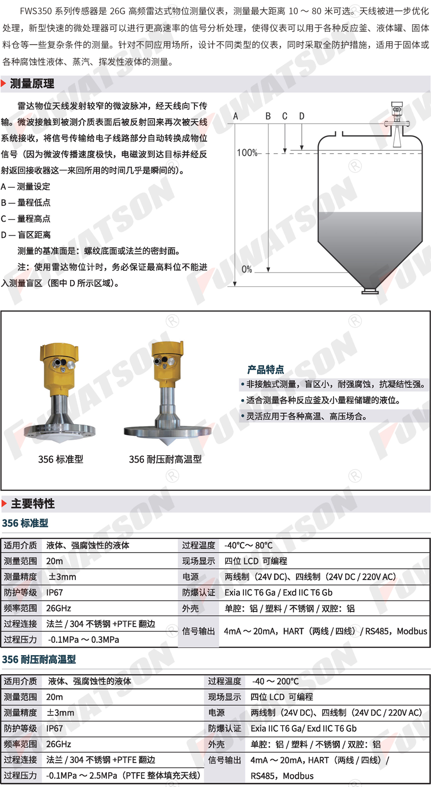 FWS350系列傳感器是26G高(gāo)頻雷達式物位測(ce)量儀表,測量最大(da)距離10~80米可選。針對(duì)不同應用場所,設(shè)計不同類型的儀(yi)表,同時采取全防(fang)護措施,适用于固(gu)體或各種腐蝕性(xing)液體、蒸汽、揮發...