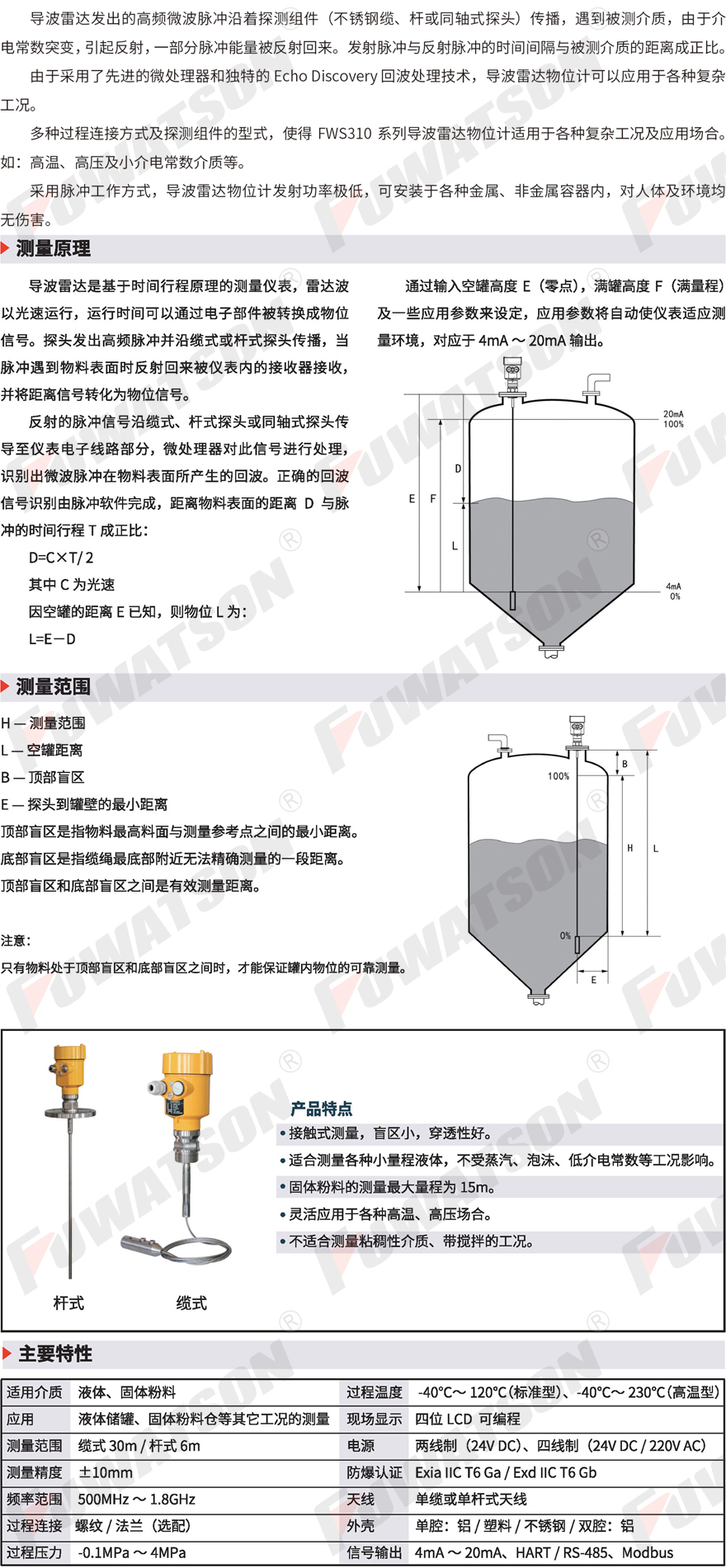 多種過程(chéng)連接方式及(jí)探測組件的(de)型式,使得 FWS310 系(xi)列導波雷達(da)物位計适用(yong)于各種複雜(zá)工況及應用(yòng)場合。如📐:高溫(wēn)、高壓及小介(jiè)電常數介質(zhì)等。...