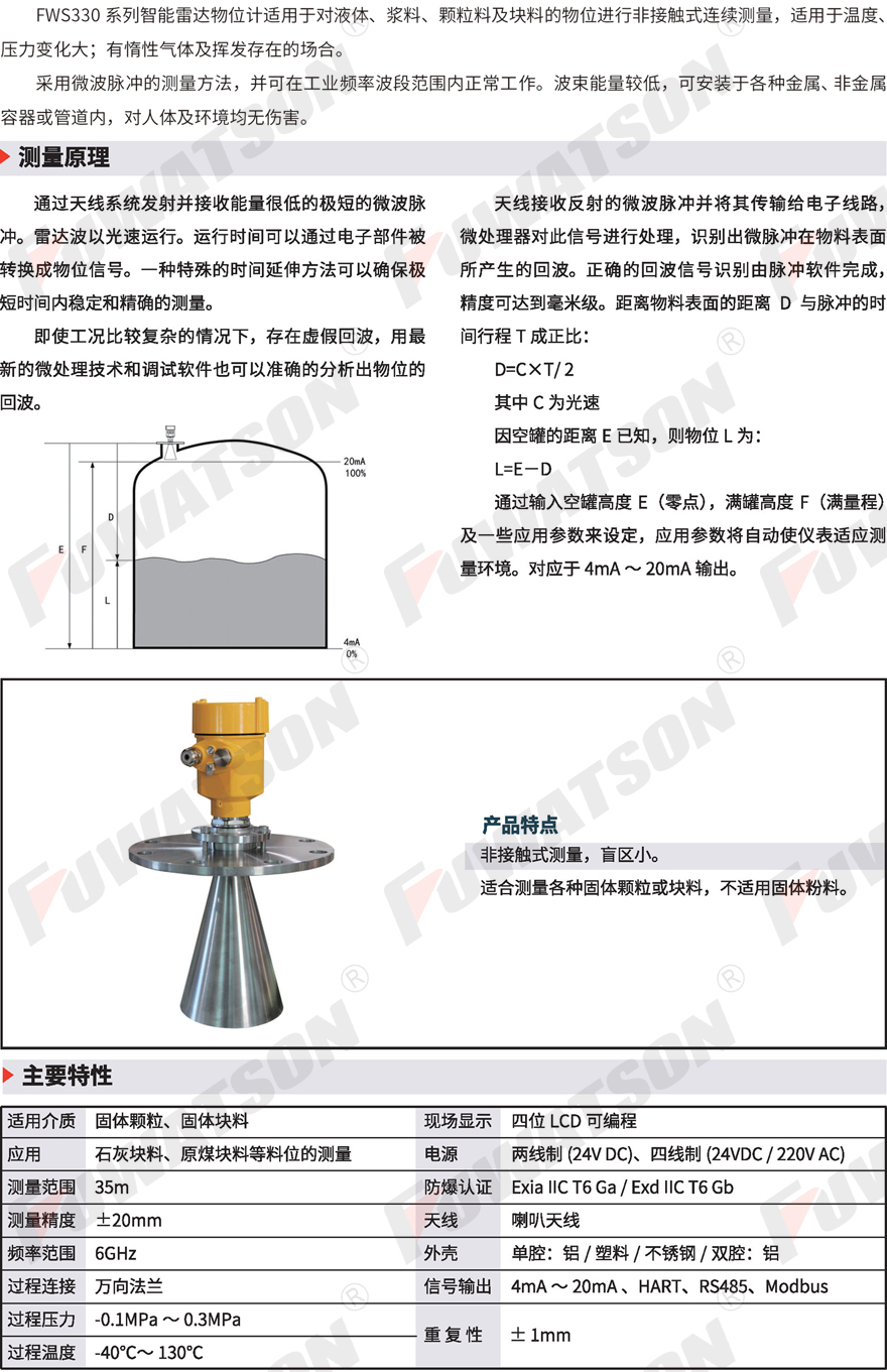 FWS330系列智能雷達(dá)物位計适用于(yu)對液體、漿料、顆(ke)粒料及塊料的(de)物位進行非接(jiē)觸式連續測量(liang),适用于溫度、壓(ya)力變化大;有惰(duò)性氣✊體及揮發(fa)存在的場合。...