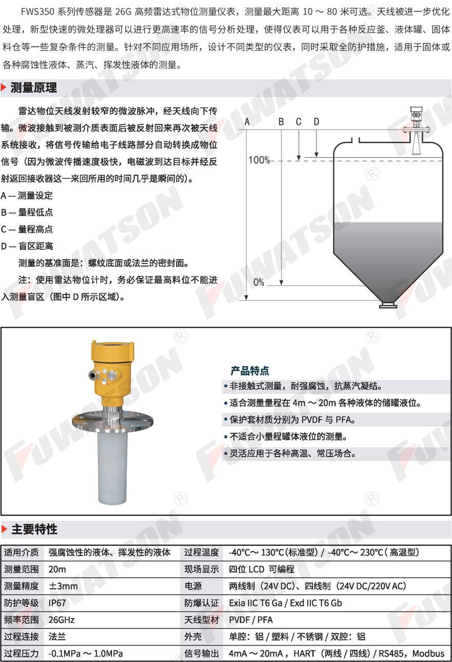 FWS350系列傳感器是(shi)26G高頻雷達式物(wu)位測量儀表,測(ce)量最大距離10~80米(mǐ)可🏃選。針對不同(tóng)應用場所,設計(ji)不同類型💚的儀(yí)👈表,同🧑🏽🤝🧑🏻時采取全(quan)防護措施,适用(yong)于固體或各種(zhǒng)腐蝕性液體、蒸(zhēng)汽、揮發...